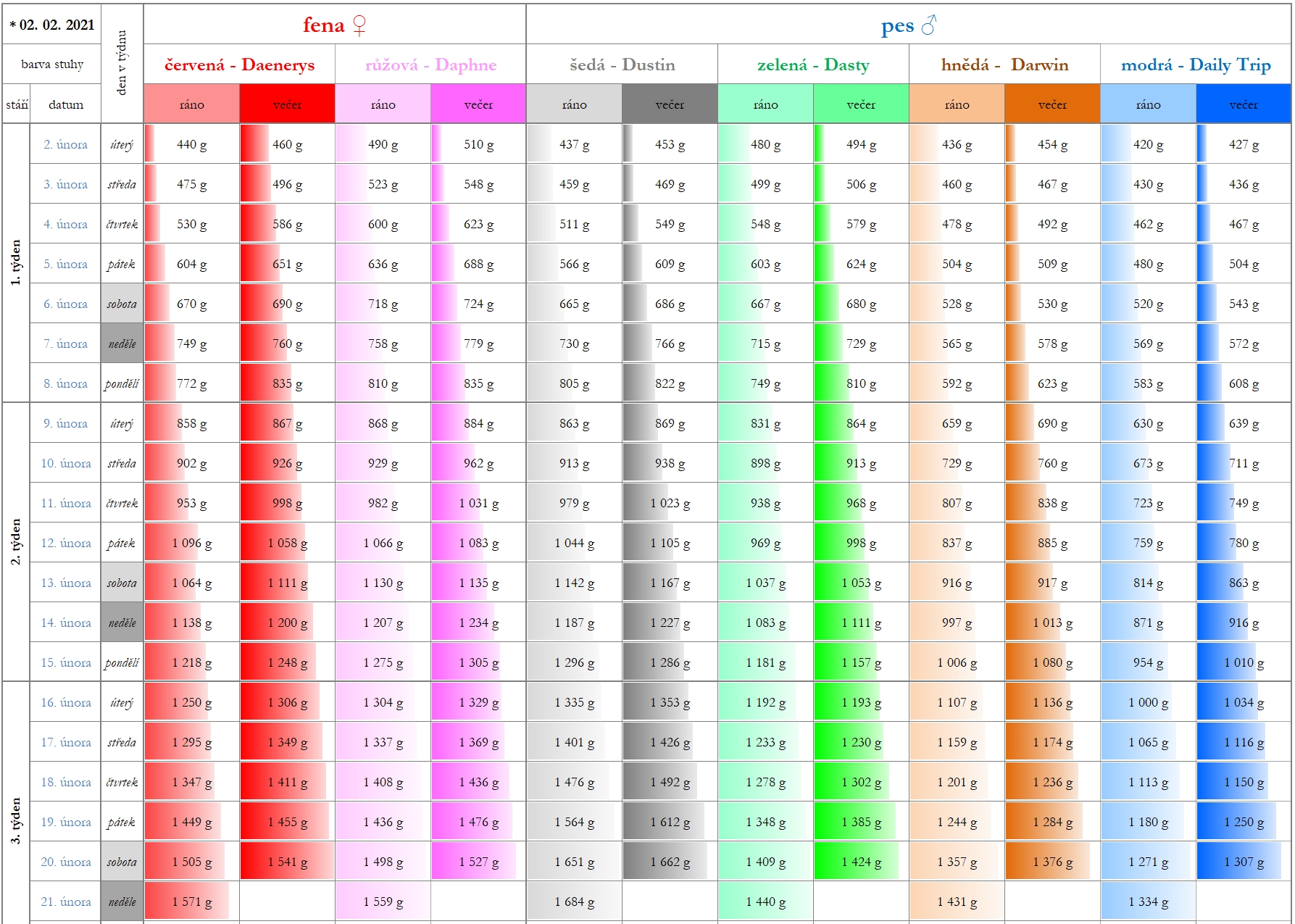 Vrh D - únor 2021 - Váhové přírůstky štěňat